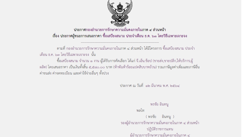 จัดซื้อ จัดจ้างประกาศผู้ชนะการเสนอราคา ประกาศผู้ชนะการเสนอราคา ซื้อเสบียงสนาม ประจำเดือน ธ.ค.๖๓ โดยวิธีเฉพาะเจาะจง (5,580.00) March 26, 2021 889 Share Facebook Twitter Google+ Telegram LINE สกบ.กอ.รมน.ภาค 4 สน.