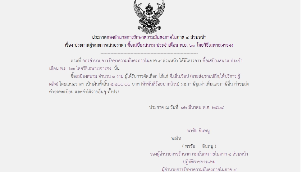 ประกาศผู้ชนะการเสนอราคา ซื้อเสบียงสนาม ประจำเดือน พ.ย.๖๓ โดยวิธีเฉพาะเจาะจง (5,400.00)