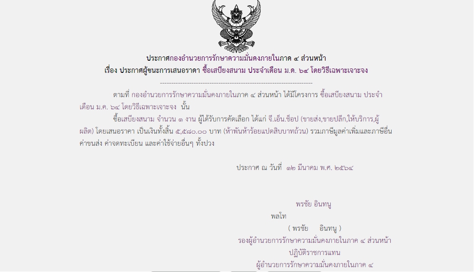 ประกาศผู้ชนะการเสนอราคา ซื้อเสบียงสนาม ประจำเดือน ม.ค.๖๔ โดยวิธีเฉพาะเจาะจง (5,580.00)