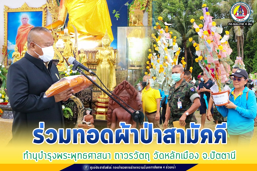 วันนี้ 27 มีนาคม 2564 เวลา 10.30 น. ณ วัดหลักเมือง ตำบลรูสะมิแล อำเภอเมือง จังหวัดปัตตานี พลโท เกรียงไกร ศรีรักษ์ แม่ทัพภาคที่ 4 / ผู้อำนวยการรักษาความมั่นคงภายในภาค 4 เป็นประธานในพิธีทอดผ้าป่าสามัคคี ทำนุบำรุงพระพุทธศาสนา และบูรณะซ่อมแซมถาวรวัตถุภายในวัด ที่มีสภาพชำรุดทรุดโทรม ตลอดจนอนุรักษ์สืบสานประเพณีวัฒนธรรมอันดีงาม และส่งเสริมความรักความสามัคคีของประชาชนในพื้นที่ โดยมีพระมหาเสาวนันท์ สุภาจาโร เจ้าอาวาสวัดหลักเมือง เป็นประธานฝ่ายสงฆ์ มีส่วนราชการ ทหาร ตำรวจ ภาครัฐ เอกชน ตลอดจนพุทธศาสนิกชนในพื้นที่ เข้าร่วมพิธีเป็นจำนวนมาก