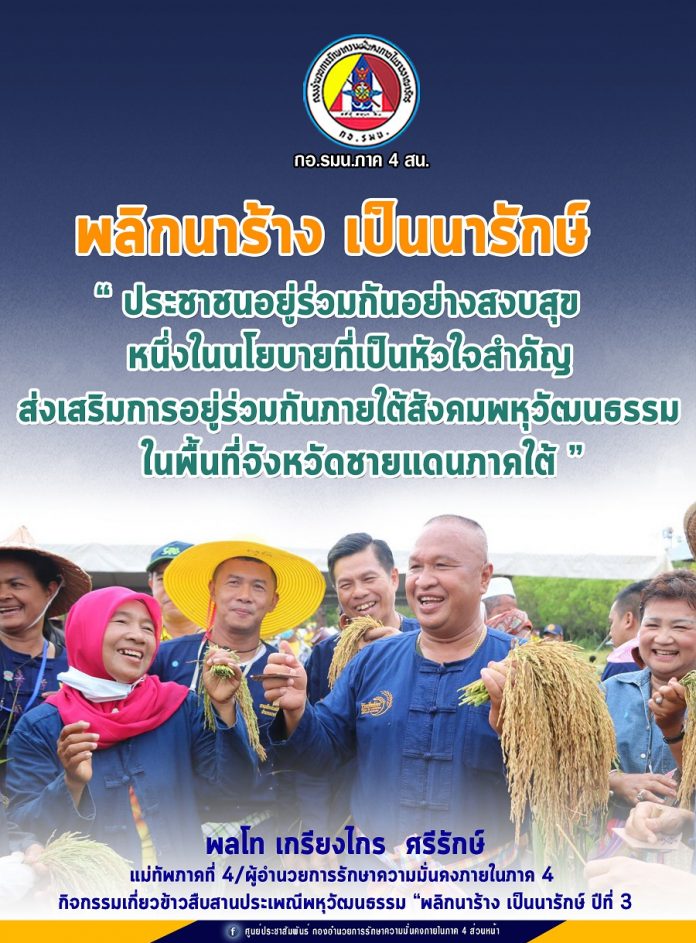 ประชาสัมพันธ์ข่าวประชาสัมพันธ์ ” พลิกนาร้าง เป็นนารักษ์ ประชาชนอยู่ร่วมกันอย่างสงบสุข หนึ่งในนโยบายที่เป็นหัวใจสำคัญ ส่งเสริมการอยู่ร่วมกันภายใต้สังคมพหุวัฒนธรรม ในพื้นที่จังหวัดชายแดนภาคใต้ “ March 29, 2021 1312 Share Facebook Twitter Google+ Telegram LINE พลโท เกรียงไกร ศรีรักษ์ แม่ทัพภาคที่ 4/ผู้อำนวยการรักษาความมั่นคงภายในภาค 4 กิจกรรมเกี่ยวข้าวสืบสานประเพณีพหุวัฒนธรรม พลิกนาร้าง เป็นนารักษ์ ปีที่ 3 ศูนย์ประชาสัมพันธ์กองอำนวยการรักษาความมั่นคงภายในภาค4ส่วนหน้า