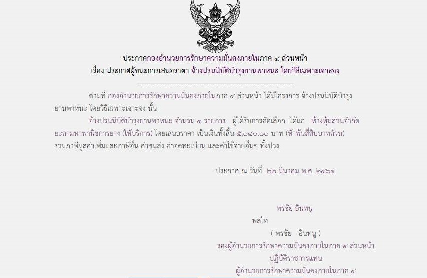 ประกาศผู้ชนะการเสนอราคา จ้างปรนนิบัติบำรุงยานพาหนะ โดยวิธีเฉพาะเจาะจง (5,040.00)