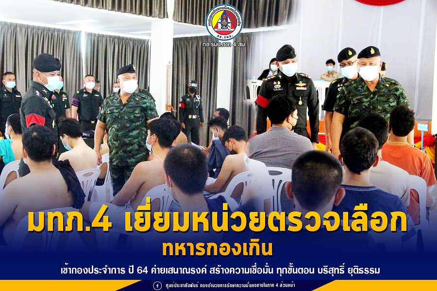 โดยแม่ทัพภาคที่ 4 ได้เดินทักทาย สอบถามบรรดาน้อง ๆ ที่เข้ามาตรวจเลือก และครอบครัวที่มาคอยให้กำลังใจ ขอให้ทุกส่วนอย่าได้มีความกังวล เพราะได้เน้นย้ำในนโยบายถึงความบริสุทธิ์ยุติธรรมทุกขั้นตอน ทุกกระบวนการในการตรวจเลือก มีความเชื่อถือได้ และให้เชื่อมั่นว่า เมื่อเข้าสู่รั้วทหารกองทัพจะดูแลบุตรหลานของท่าน ให้มีระเบียบวินัย เป็นสุภาพบุรุษลูกผู้ชาย มีองค์ความรู้เพิ่มเติมในด้านต่าง ๆ พร้อมสวัสดิการอย่างดีที่สุด เป็นทหารได้อะไรมากกว่าที่คิด นอกจากนั้นแล้วแม่ทัพภาคที่ 4 ยังคงเน้นย้ำ ให้ประธานกรรมการตรวจเลือกและเจ้าหน้าที่ทุกส่วน คำนึงถึงข้อกำหนดมาตรการการป้องกันการแพร่ระบาดของเชื้อไวรัส covid-19 อย่างเคร่งครัดอีกด้วย
