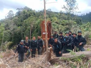 เจ้าหน้าที่เดินเท้าจากจุดจอดรถขึ้นไปบนภูเขาประมาณ 2 กิโลเมตรถึงเขตแนวชายแดนไทย – มาเลเซีย ระหว่างใกล้หลักเขตแดนที่ 48 ตรวจพบพื้นที่ป่าไม้สมบูรณ์ถูกทำลาย จำนวน 1 แปลง ที่บริเวณพิกัด ความสูงจากรระดับน้ำทะเลปานกลาง 869 เมตร ตรวจวัดพื้นที่ป่าไม้ถูกทำลายได้ประมาณ 2-3-98 ไร่ ต้นไม้ขนาดกลาง – ขนาดเล็ก ถูดตัดด้วยเครื่องเลื่อยโซ่ยนต์ล้มคาตอ ต้นไม้ขนาดเล็ก ไม้พื้นล่าง วัชพืช ถูกตัดฟันด้วยมีดพร้า ไม้เผาทำลาย มีร่องรอยการทำสวนผลไม้ แต่พื้นที่บางส่วนยังไม่ปลูกพืชอะไร ทำการตรวจวัดไม้ จำนวน 12 ต้น เช่น ไม้สยา ไม้ฝาด ไม้มันหมู ไม้กาลอ ไม้แดงเขา
