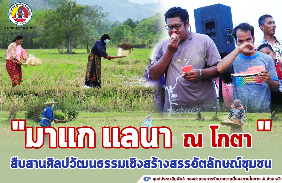 ที่ทุ่งนาชุมชนบาโงตาแย ตำบลโกตาบารู อำเภอรามัน จังหวัดยะลา นายสุกิจ พัฒนพงษ์ นายอำเภอรามัน, นายวิชาพร ชินประพัทธ์ ผู้อำนวยการวิทยาลัยชุมชนยะลา และนักศึกษาของวิทยาลัย พร้อมด้วยชาวบ้านในตำบลโกตาบารู อำเภอรามัน จังหวัดยะลา ร่วมกิจกรรมโครงการอนุรักษ์สืบสานวัฒนธรรมเชิงสร้างสรรค์อัตลักษณ์ชุมชน ภายใต้ชื่อโครงการ “มาแก แลนา ณ โกตา” ซึ่ง “มาแก” เป็นภาษายาวี มีความหมายว่า กิน ส่วนคำว่า “แลนา” เป็นภาษาใต้ มีความหมายว่า ดูนา ซึ่งสอดคล้องกับวิถีพหุวัฒนธรรมของคนในชุมชนที่นี้