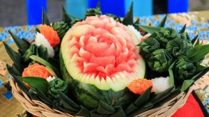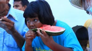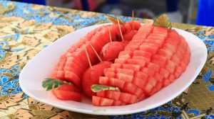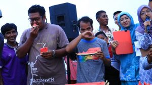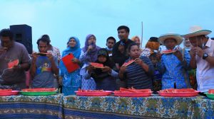 และไฮไลท์สุดท้ายคือ การแข่งขันกินแตงโม ซึ่งมีผู้เข้าร่วมการแข่งขัน ที่เป็นทั้งคนในชุมชน และข้าราชการในพื้นที่ โดยการแข่งขันให้ผู้เข้าร่วมแข่งขันทุกคนแข่งกันกินแตงโม ซึ่งเป็นผลไม้ประจำพื้นที่ตำบลโกตาบารูในช่วงเข้าสู่เดือนเมษายน หรือฤดูแล้ง ชาวบ้านจะหันมาปลูกแตงโมขาย และแตงโมที่ปลูกที่ ตำบลโกตาบารูนี้ มีรสชาติหวานกรอบ ซึ่งผู้ที่เข้าแข่งขันจะต้องกินแตงโมที่มีอยู่ในถาดจำนวน 10 ชิ้นให้หมด ใครที่กินหมดก่อนจะเป็นผู้ชนะ และการแข่งขันก็เริ่มขึ้น ผู้เข้าร่วมแข่งขันทั้ง 9 คน ก็ต่างขะมักเขม้นในการกินแตงโมกัน โดยไม่สนใจใครทั้งนั้น เมื่อกินไปได้สักพัก ผู้เข้าแข่งขันต่างเริ่มมีอาการ ตามที่เห็นในภาพ และสุดท้าย ผู้ชนะ อันดับที่ 1-2-3 ก็เป็นประชาชนที่เข้าร่วมการแข่งขันในครั้งนี้ โดยสร้างความสนุกสนาน ทั้งเสียงเชียร์และรอยยิ้มกันไปทั้งงาน นอกจากนี้ก็ยังมีการออกร้านนิทรรศการของกลุ่มนักศึกษาอีกจำนวน 11 ร้านด้วยกัน