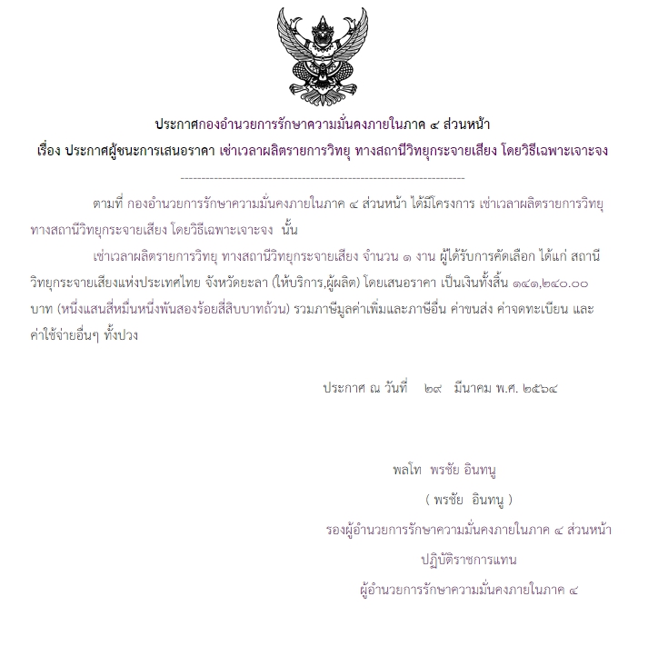 จัดซื้อ จัดจ้างประกาศผู้ชนะการเสนอราคา ประกาศผู้ชนะการเสนอราคา เช่าเวลาผลิตรายการวิทยุกระจายเสียง โดยวิธีเฉพาะเจาะจง (141,240.00) April 6, 2021 746 Share Facebook Twitter Google+ Telegram LINE สกบ.กอ.รมน.ภาค 4 สน.