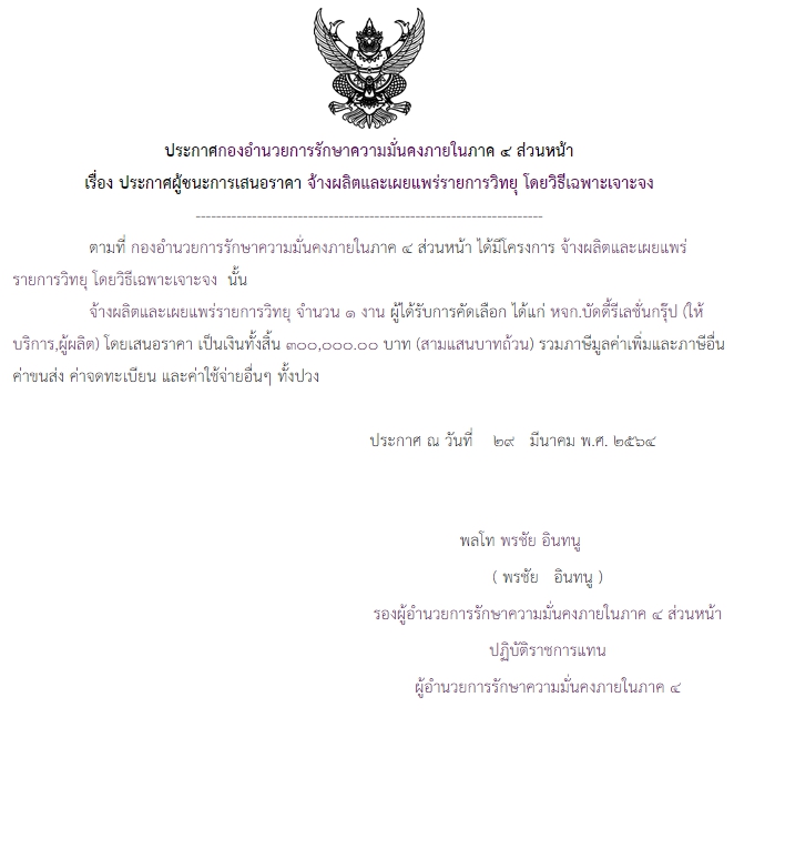ประกาศผู้ชนะการเสนอราคา จ้างผลิตและเผยแพร่รายการวิทยุ โดยวิธีเฉพาะเจาะจง (300,000.00)