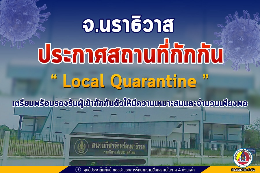 ทั้งนี้ มีสถานที่กักกัน Local Quarantine ในพื้นที่ 13 อำเภอ รวม 27 แห่ง รองรับผู้กักกันตัวได้ 893 คน นอกจากนี้ยังจัดเตรียมสถานที่สนามกีฬามหาราช อำเภอสุไหงโก-ลก เป็นสถานที่พักคอย หรือสถานที่กักกัน กรณีมีเหตุขำเป็นเร่งด่วนที่ไม่สามารถส่งผู้กักกันเข้าสถานที่กักกันอื่นได้ทันที