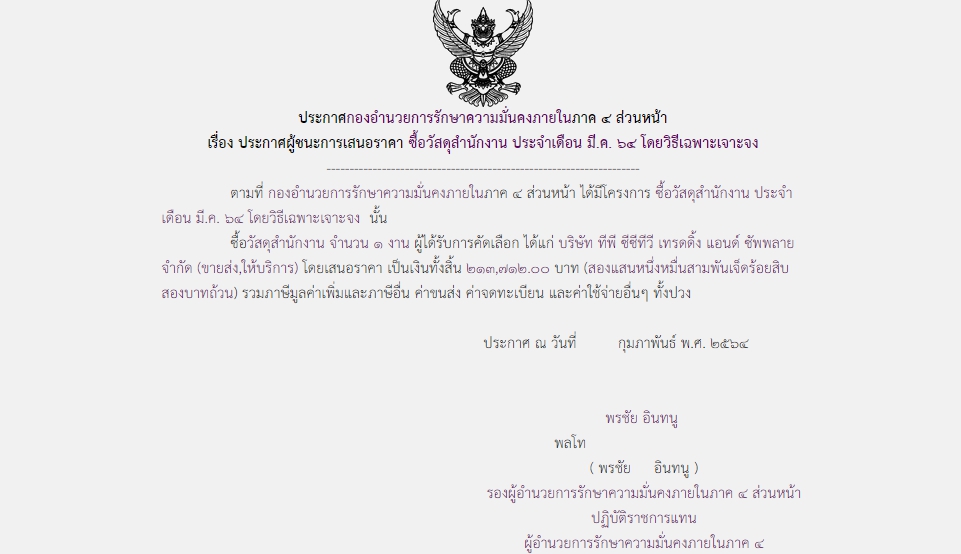ประกาศผู้ชนะการเสนอราคา ซื้อวัสดุสำนักงาน ประจำเดือน มี.ค.๖๔ โดยวิธีเฉพาะเจาะจง ( ๒๑๓,๗๑๒.๐๐ บาท )
