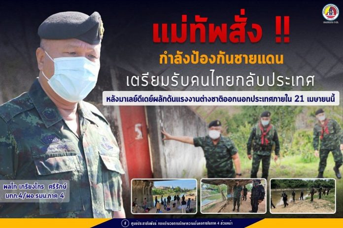 พลโท เกรียงไกร ศรีรักษ์ แม่ทัพภาคที่ 4 /ผู้อำนวยการรักษาความมั่นคงภายในภาค 4 กล่าวว่า ภายหลังมาเลเซียเร่งรัดผลักดันให้ชาวต่างชาติที่อาศัยในเมืองผิดกฎหมาย ต้องเดินทางออกจากประเทศก่อนวันที่ 21 เมษายน 2564 โดยเฉพาะกลุ่มคนไทยที่อยู่ในมาเลเซียนั้น เราได้มีการเตรียมการรับมือเรื่องนี้ไว้แล้วโดยได้ประสานจังหวัดต่างๆ ที่อยู่ติดชายแดนมาเลเซียให้มีมาตรการรับมือทั้งเรื่องของสถานที่สำหรับรองรับกลุ่มดังกล่าว ทั้งยังได้สั่งการให้หน่วยกำลังทุกหน่วยประสานกับผู้ว่าราชการจังหวัดอย่างใกล้ชิด ตลอดจนหน่วยงานสาธารณสุข และหน่วยที่เกี่ยวข้อง โดยนำมาตรการที่เคยใช้ควบคุมโรคโควิด 19 ที่ใช้ได้ผลเป็นอย่างดีมายกระดับเพิ่มเติม ส่วนกำลังเจ้าหน้าที่ป้องกันตามแนวชายแดนก็ได้สั่งให้เข้มงวดมาตรการดูแลสกัดกั้นตามแนวชายแดน ซึ่งได้ดำเนินการมาโดยตลอดตั้งแต่มีนาคมปีที่แล้ว โดยได้มีการตรวจตราตามแนวชายแดนอย่างเข้มงวด เพิ่มเติมกำลังเจ้าหน้าที่เฝ้าตรวจตามแนวชายแดน โดยเฉพาะการเข้ามาผ่านช่องทางธรรมชาติผิดกฎหมาย ของแรงงานคนไทยที่ไปทำงานยังมาเลเซีย ที่จะต้องนำเข้ากระบวนการ Quarantine ป้องกันโรคโควิด 19 ทุกคน เพื่อป้องกันการแพร่ระบาดของเชื้อ สำหรับชายแดนที่ต้องดูแลเป็นพิเศษนั่นคือ ฝั่งจังหวัดนราธิวาสและสงขลา เพราะมีช่องทางธรรมชาติที่หลายช่องทาง ที่สามรถแอบลักลอบเข้ามาได้ ประกอบกับทั้ง 2 จังหวัดนี้ ขณะนี้เป็นพื้นที่สีแดงที่ต้องมีการควบคุมสูงสุด เนื่องจากมีระบาดจำนวนมาก โดยเฉพาะทางจังหวัดนราธิวาส ที่มักมีผู้ลักลอบเข้ามาทางฝั่ง อ.ตากใบ อ.แว้ง และ อ.สุไหงโกลก โดยข้ามแม่น้ำเข้ามา ยิ่งช่วงนี้หน้าแล้ง น้ำแห้งทำให้สามารถข้ามมาได้โดยสะดวก ยิ่งมาเลเซียผลักดันอาจทำให้มีคนแอบลักลอบเข้ามามายิ่งขึ้น โดยเมื่อวานนี้สามารถจับกุมได้กว่า 40 คน ก็ได้นำเข้ากักตัวสังเกตอาการทั้งหมด นอกจากกำลังเจ้าหน้าที่แล้วก็ได้ประสานกำนัน ผู้ใหญ่บ้าน อาสาสมัครสาธารณสุขประจำหมู่บ้าน ได้ช่วยกันเป็นหูเป็นตาดูแล ช่วยด้วยอีกทางหนึ่ง สำหรับชายแดนที่ติดทางทะเล จ.สตูล ก็ได้ให้กำลังป้องกันชายแดน โดยกองกำลังเทพสตรี เฝ้าระวังอย่างใกล้ชิด และเข้มงวดกวดขันยังจุดที่เป็นเกาะแก่งต่างๆ ที่คาดว่าอาจมีการลักลอบเข้ามา โดยส่วนใหญ่มาทางเรือ ก็ได้ประสานการทำงานร่วมกับทัพเรือภาค 3 ในการลาดตระเวนทางทะเลเพื่อป้องกันอย่างเต็มที่
