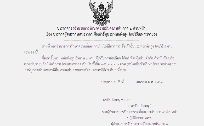 ประกาศผู้ชนะการเสนอราคา ซื้อเก้าอี้บุนวมพนักพิงสูง โดยวิธีเฉพาะเจาะจง (15,600.00)