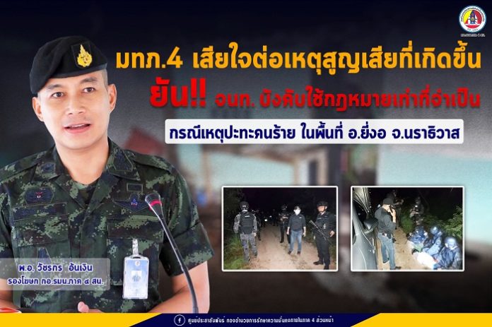 ทั้งนี้ ขอยืนยันว่ากองอำนวยการรักษาความมั่นคงภายในภาค 4 ส่วนหน้า ยังคงยึดมั่นการแก้ปัญหาในพื้นที่จังหวัดชายแดนภาคใต้ ตามแนวทางสันติวิธี โดยใช้แนวทางการเมืองนำการทหาร ด้วยการใช้เวทีสภาสันติสุขตำบล ทั้ง 282 ตำบล 8 ชุมชนเทศบาล เพื่อรับฟังความคิดเห็นและแก้ไขปัญหาให้ตรงตามความต้องการของพี่น้องประชาชนในพื้นที่ ควบคู่ไปกับการบังคับใช้กฎหมายกับผู้ก่อเหตุรุนแรง และผู้ให้การสนับสนุนเพื่อตัดวงจรการก่อเหตุรุนแรงและคืนความยุติธรรมให้เหยื่อที่ถูกละเมิด พร้อมกับขอความร่วมมือมายังพี่น้องประชาชนในพื้นที่ หากพบเห็นสิ่งผิดปกติ หรือบุคคลต้องสงสัยเข้ามาเคลื่อนไหวในพื้นที่ สามารถแจ้งได้ที่เบอร์สายตรงแม่ทัพภาคที่ 4 โทร 061 – 173 – 2999 หรือเบอร์สายด่วน 1341 และหน่วยเฉพาะกิจในพื้นที่ได้ตลอด 24 ชั่วโมง