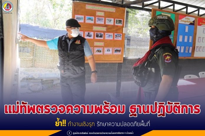โดยแม่ทัพภาคที่ 4 ได้พบปะกำลังพลเจ้าหน้าที่ ตรวจสภาพความพร้อมสถานที่ปฏิบัติการ ก่อนให้นโยบายการควบคุมพื้นที่ให้เกิดความปลอดภัย ทั้งต่อกำลังพลเจ้าหน้าที่และพี่น้องประชาชน โดยแม่ทัพภาคที่ 4 ได้เน้นย้ำแก่กำลังพลว่า “การควบคุมดูแลพื้นที่เสี่ยงให้เกิดความปลอดภัยทั้งต่อกำลังพลเจ้าหน้าที่และพี่น้องประชาชนนั้น ทุกคนต้องไม่ประมาท และปฏิบัติการเชิงรุกตลอดเวลา เพิ่มมาตรการรักษาความปลอดภัยฐานปฏิบัติการ ระมัดระวังการซุ่มโจมตีฐานปฏิบัติการของตน หมั่นฝึกฝนกำลังเจ้าหน้าที่ให้มีความชำนาญ แข็งแกร่ง รู้จักประเมินและวางแผน รับมือกับทุกสถานการณ์ปฏิบัติงานเชิงรุกได้อย่างมีประสิทธิภาพ และปฏิบัติการอย่างรวดเร็วทันท่วงที การปฏิบัติทั้งชุดจรยุทธและกิจการพลเรือนแบบเชิงรุกต้องควบคู่กันไปภายใต้การมีส่วนร่วมของผู้นำท้องที่ ท้องถิ่น ผู้นำศาสนา เพื่อเป็นการสร้างเครือข่ายและสร้างการรับรู้ ทำลายโครงสร้างของและจำกัดเสรีการปฏิบัติของกลุ่มผู้ก่อเหตุ โดยเจ้าหน้าที่สามารถบังคับใช้กฎหมายแต่ต้องเป็นไปตามขั้นตอนอย่างรัดกุมโดยปราศจากความสูญเสีย และในห้วงสถานการณ์ปัจจุบันที่เจ้าหน้าที่จะต้องรับมือกับภัยคุกคามด้านโรคระบาด สิ่งจำเป็นนอกเหนือจากการควบคุมพื้นที่แล้วยังต้องควบคุมการระบาดของโรค ดังนั้นเจ้าหน้าที่จะต้องเป็นตัวอย่างที่ดีในการป้องกันตนเอง และสร้างการรับรู้แก่พี่น้องประชาชน เพื่อช่วยกันระงับยับยั้งการแพร่กระจายของเชื้อเข้าสู่พื้นที่ ถึงเวลาแล้วที่ทุกหน่วยจะต้องดำเนินภารกิจแก้ไขปัญหาจังหวัดชายแดนภาคใต้อย่างจริงจัง สร้างความสงบสุข ยุติเหตุรุนแรง สร้างสันติสุขให้กับพี่น้องประชาชน อย่างเป็นรูปธรรม”