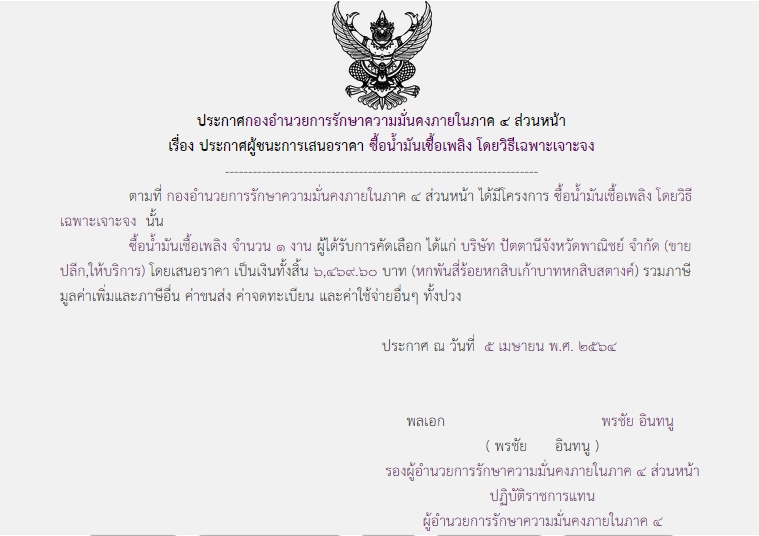 ประกาศผู้ชนะการเสนอราคา ซื้อน้ำมันเชื้อเพลิง โดยวิธีเฉพาะเจาะจง ( ๖,๔๖๙.๖๐ บาท )