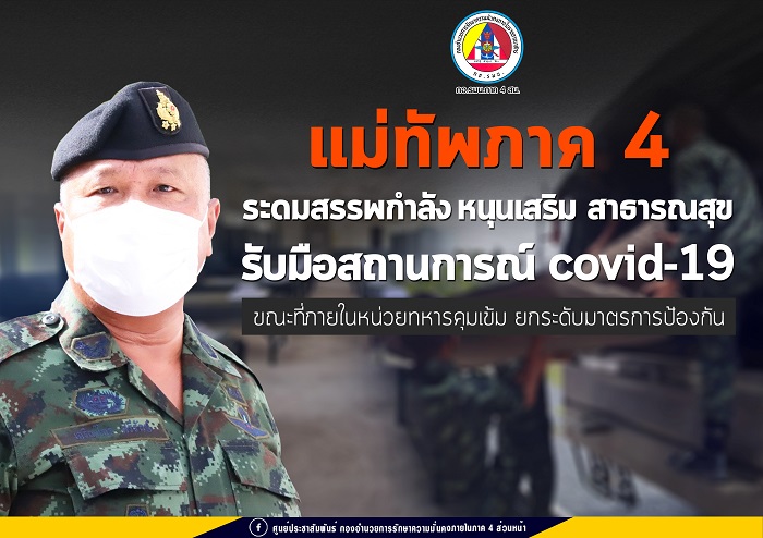 แม่ทัพภาคที่ 4 สั่งระดมสรรพกำลัง กองทัพภาคที่ 4 สนับสนุนการทำงานของสาธารณสุขในพื้นที่ภาคใต้ รองรับการแพร่ระบาดของเชื้อไวรัส COVID-19 ที่มีผู้ติดเชื้อและรอรับการรักษาเพิ่มจำนวนมาก ทั้งนี้จากสถานการณ์การแพร่ระบาดของเชื้อ COVID-19 กระทรวงกลาโหม ได้เรียกประชุมเหล่าทัพ กอ.รมน. ตลอดจนหน่วยงานที่เกี่ยวข้อง ผ่านระบบทางไกล เพื่อระดมกำลังและยุทโธปกรณ์เข้าเสริมและสนับสนุนการทำงานของกระทรวงสาธารณสุข รับมือกับสถานการณ์ COVID-19 อย่างเร่งด่วน โดยได้กำชับทุกเหล่าทัพ ระดมทรัพยากรที่มีอยู่เข้าไปเสริมและสนับสนุนการทำงานในพื้นที่ เพื่อรองรับกับสถานการณ์การแพร่ระบาดของ COVID-19 ที่มีผู้ป่วยติดเชื้อและรอรับการรักษาเพิ่มมากขึ้นในตอนนี้