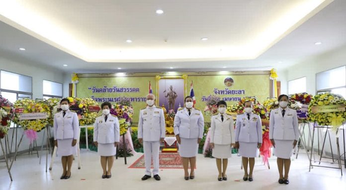 วันนี้ (25 เมษายน 2564) ที่บริเวณหน้าห้องศรียะลา อาคาร 3 ชั้น 3 ศาลากลางจังหวัดยะลา อำเภอเมือง จังหวัดยะลา นายชัยสิทธิ์ พานิชพงศ์ ผู้ว่าราชการจังหวัดยะลา นำส่วนราชการ ประกอบพิธีวางพวงมาลาถวายราชสักการะ เบื้องหน้าพระบรมสาทิสลักษณ์สมเด็จพระนเรศวรมหาราช พร้อมนำกล่าวถวายราชสดุดี รำลึกถึงพระมหากรุณาธิคุณสมเด็จพระนเรศวรมหาราช ท่ามกลางมาตราการคัดกรองโควิด-19 (ระลอกเมษายน) อย่างเข้มงวด
