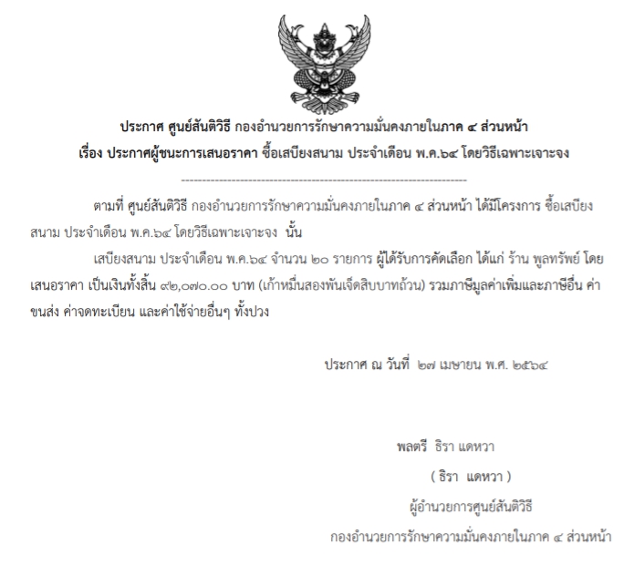 จัดซื้อ จัดจ้างประกาศผู้ชนะการเสนอราคา ประกาศผู้ชนะการเสนอราคา ซื้อเสบียงสนาม ประจำเดือน พ.ค.๖๔ โดยวิธีเฉพาะเจาะจง ( ๙๒,๐๗๐.๐๐ บาท ) April 27, 2021 767 Share Facebook Twitter Google+ Telegram LINE ศูนย์สันติวิธี กอ.รมน.ภาค ๔ สน.