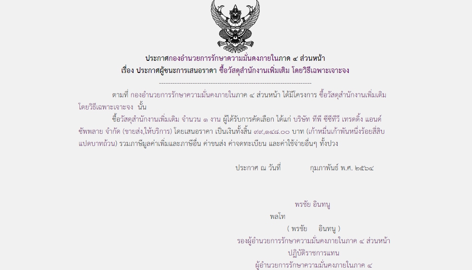 ประกาศผู้ชนะการเสนอราคา ซื้อวัสดุสำนักงานเพิ่มเติม โดยวิธีเฉพาะเจาะจง ( ๙๙,๑๔๘.๐๐ บาท )