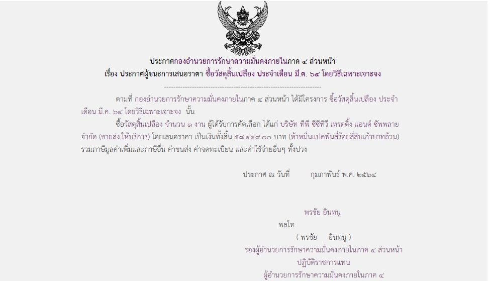 จัดซื้อ จัดจ้างประกาศผู้ชนะการเสนอราคา ประกาศผู้ชนะการเสนอราคา ซื้อวัสดุสิ้นเปลือง ประจำเดือน มี.ค. ๖๔ โดยวิธีเฉพาะเจาะจง ( ๕๘,๔๔๙.๐๐ บาท ) April 27, 2021 1001 Share Facebook Twitter Google+ Telegram LINE กอ.รมน.ภาค ๔ สน.
