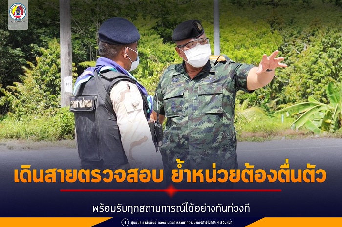 ทั้งนี้ ตลอดเส้นทางการเดินสายตรวจเยี่ยม แม่ทัพภาคที่ 4 ได้ลงไปพูดคุยทักทาย มอบเครื่องอุปกรณ์เพื่อการป้องกันตนเอง ทั้งนี้เพื่อให้กำลังใจแก่เจ้าหน้าที่ประจำด่านตรวจ จุดตรวจ ให้ ปฏิบัติภารกิจด้วยความปลอดภัย เข้มแข็ง เป็นส่วนหนึ่งในการเฝ้าระวังเหตุการณ์ความไม่สงบ และ เฝ้าระวังการแพร่ระบาดของเชื้อไวรัส covid-19 ให้ผ่านพ้นวิกฤตนี้ไปด้วยกัน