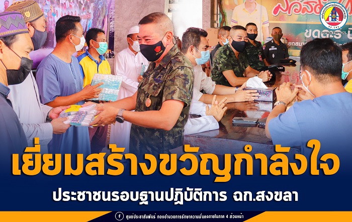 เมื่อวันที่ 27 เมษายน 2564 เวลา 10.30 น. พลตรี ศานติ ศกุนตนาค ผู้บัญชาการกองพลทหารราบที่ 5 / ผู้บังคับหน่วยเฉพาะกิจสงขลา ลงพื้นที่บริเวณชุมชนรอบฐานปฏิบัติการเฉพาะกิจสงขลา บ้านนิคมเทพา หมู่ที่ 3 ตำบลท่าม่วง อำเภอเทพา จังหวัดสงขลา เพื่อพบปะพัฒนาสัมพันธ์กับประชาชนรอบฐานปฏิบัติการหน่วยเฉพาะกิจสงขลา พบปะประชาชนในพื้นที่ สานสัมพันธ์ ตลอดจนรับทราบปัญหาข้อขัดข้องต่าง ๆ พร้อมทั้งได้ประชาสัมพันธ์ เรื่อง “การแพร่ระบาดและวิธีป้องกันเชื้อไวรัส Covid-19” โดยได้นำเวชภัณฑ์ป้องกันเชื้อไวรัส Covid-19 มามอบให้แก่ประชาชนในพื้นที่