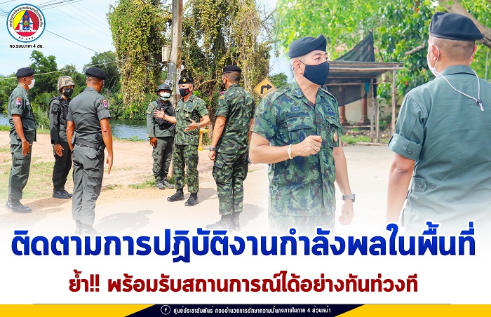 จากนั้น ผู้บัญชาการกองพลทหารราบที่ 5 / ผู้บังคับหน่วยเฉพาะกิจสงขลา เดินทางต่อไปยัง หมวดเฉพาะกิจตำรวตระเวนชายแดนที่ 4332 บ้านใหม่ผาสุก ตำบลคลองเปียะ อำเภอจะนะ จังหวัดสงขลา เพื่อตรวจเยี่ยมติดตามผลการปฏิบัติงานของกำลังพล ตามนโยบายของผู้อำนวยการรักษาความมั่นคงภายในภาค 4 เน้นย้ำให้กำลังพลมีความพร้อมในการปฏิบัติงานทั้งการตั้งจุดตรวจ/จุดสกัด และการติดต่อสื่อสาร รวมทั้งสามารถตอบโต้กลุ่มผู้ก่อเหตุรุนแรงได้อย่างทันท่วงที