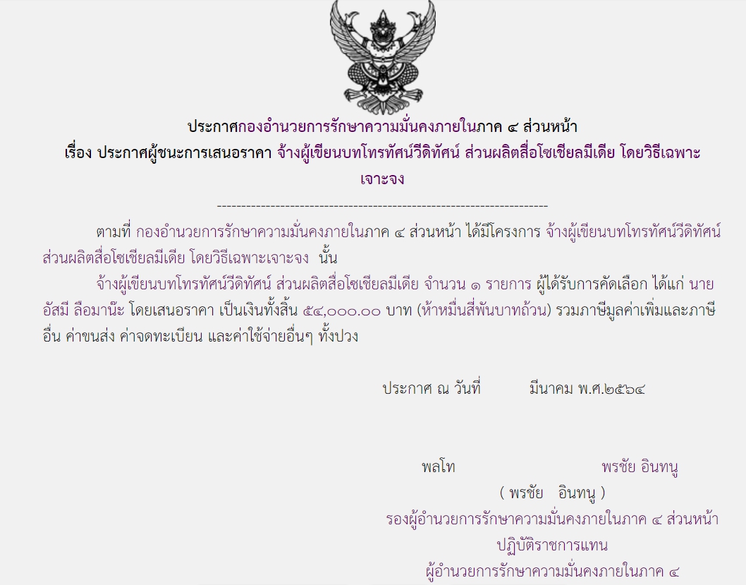 จัดซื้อ จัดจ้างประกาศผู้ชนะการเสนอราคา ประกาศผู้ชนะการเสนอราคา จ้างผู้เขียนบทโทรทัศน์วีดิทัศน์ ส่วนผลิตสื่อโเชียลมีเดีย โดยวิธีเฉพาะเจาะจง ( ๕๔,๐๐๐.๐๐ บาท ) April 28, 2021 981 Share Facebook Twitter Google+ Telegram LINE กอ.รมน.ภาค ๔ สน.