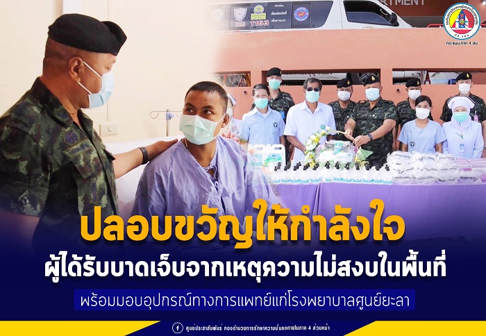 พลโท เกรียงไกร ศรีรักษ์ แม่ทัพภาคที่ 4 /ผู้อำนวยการรักษาความมั่นคงภายในภาค 4 ได้กล่าวขอบคุณสำหรับการทำงานอย่างเต็มกำลังความสามารถของบุคลากรทางการแพทย์ เป็นกำลังสำคัญที่เสียสละ พร้อมเน้นย้ำหากขาดเหลือสิ่งใด มีความต้องการสิ่งใดให้กองอำนวยการรักษาความมั่นคงภายในภาค 4 ส่วนหน้าช่วยเหลือ เพื่อให้การดำเนินงานเป็นไปอย่างราบรื่น ก็พร้อมจะดำเนินการทันที และขอเป็นกำลังใจให้บุคลากรทางการแพทย์ทุกท่านในการปฏิบัติงานท่ามกลางสถานการณ์การแพร่ระบาดของเชื้อไวรัสโควิด 19 ทั้งนี้ ได้มอบอุปกรณ์ทางการแพทย์ ได้แก่ ชุด PPE จำนวน 56 ชุด, หน้ากากอนามัย N95 จำนวน 200 ชิ้น, ถุงมือยาง จำนวน 23 กล่อง, Face shield จำนวน 30 ชิ้น, แว่น จำนวน 52 ชิ้น, อุปกรณ์สำนักงาน จำนวน 6 ถุง และแกลลอนเจล จำนวน 2 แกลลอน ให้แก่โรงพยาบาลศูนย์ยะลา