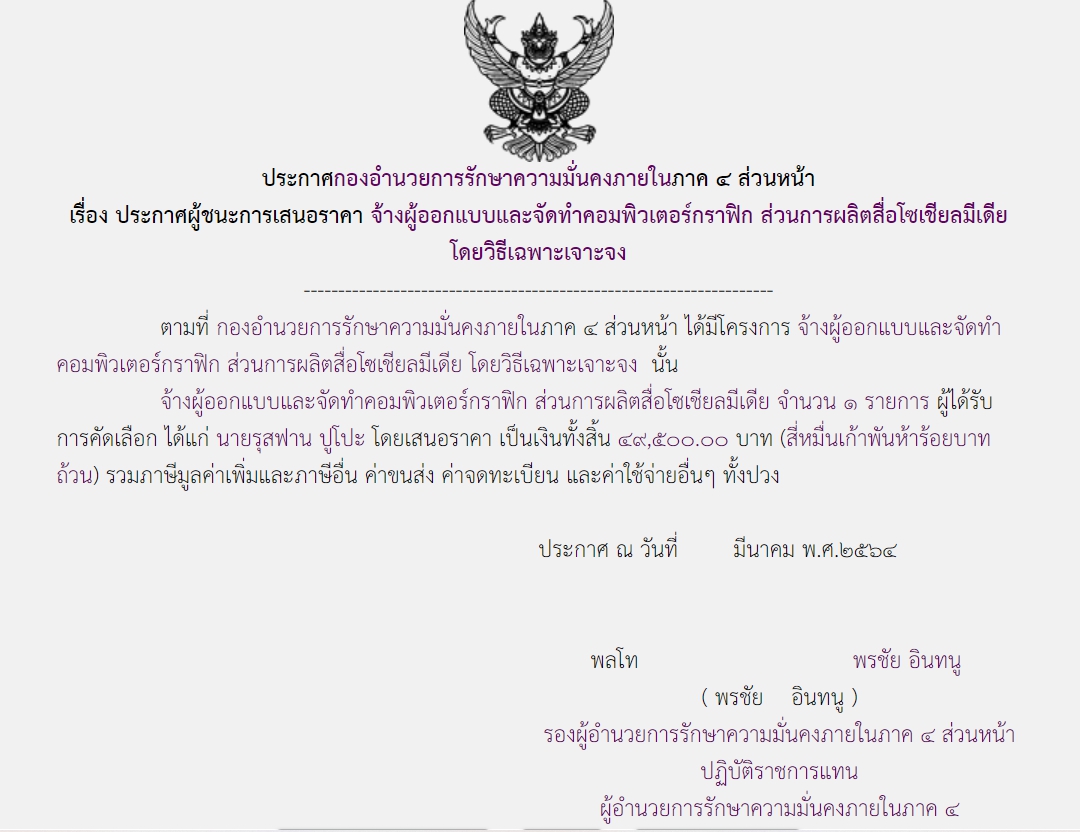 จัดซื้อ จัดจ้างประกาศผู้ชนะการเสนอราคา ประกาศผู้ชนะการเสนอราคา จ้างผู้ออกแบบและจัดทำคอมพิวเตอร์กราฟิก ส่วนการผลิตสื่อโซเชียลมีเดีย โดยวิธีเฉพาะเจาะจง ( ๔๙,๕๐๐.๐๐ บาท ) April 29, 2021 748 Share Facebook Twitter Google+ Telegram LINE กอ.รมน.ภาค ๔ สน.