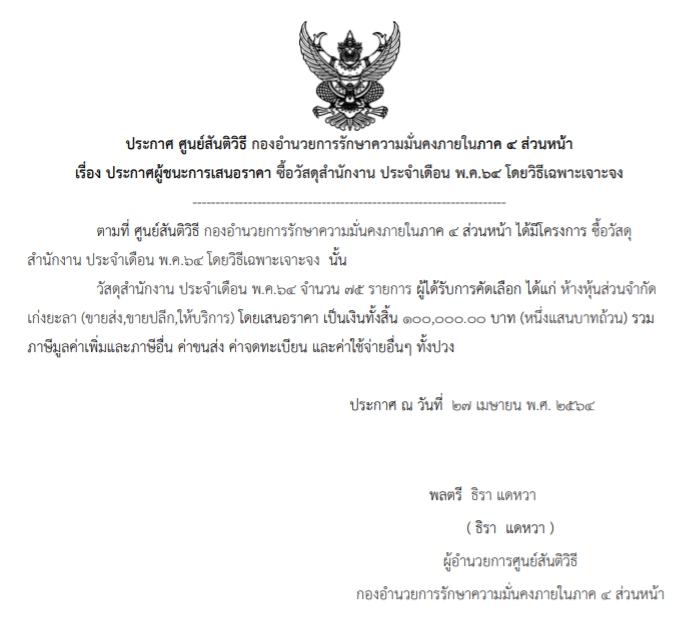 จัดซื้อ จัดจ้างประกาศผู้ชนะการเสนอราคา ประกาศผู้ชนะการเสนอราคา ซื้อวัสดุสำนักงาน ประจำเดือน พ.ค.๖๔ โดยวิธีเฉพาะเจาะจง ( ๑๐๐,๐๐๐.๐๐ บาท ) April 29, 2021 795 Share Facebook Twitter Google+ Telegram LINE ศูนย์สันติวิธี กอ.รมน.ภาค ๔ สน.