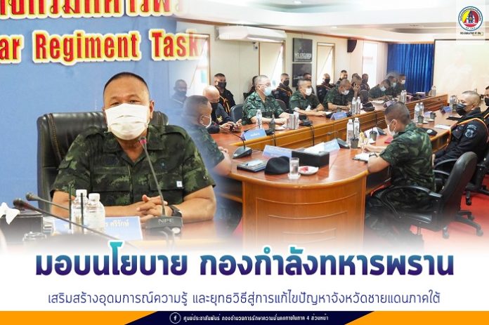 วันนี้ 30 เมษายน 2564 เวลา 10.00 น. พลโท เกรียงไกร ศรีรักษ์ แม่ทัพภาคที่ 4 /ผู้อำนวยการรักษาความมั่นคงภายในภาค 4 เดินทางพร้อมด้วย คณะที่ปรึกษา และฝ่ายอำนวยการกองอำนวยการรักษาความมั่นคงภายในภาค 4 ส่วนหน้า ตรวจเยี่ยมการปฏิบัติงาน ของเจ้าหน้าที่หน่วยเฉพาะกิจกรมทหารพรานที่ 42 อำเภอปะนาเระ จังหวัดปัตตานี และ หน่วยเฉพาะกิจกรมทหารพรานที่ 49 อำเภอศรีสาคร จังหวัดนราธิวาส เพื่อเน้นย้ำการปฏิบัติงานให้คงประสิทธิภาพ ปฏิบัติภารกิจในการดูแลควบคุมพื้นที่ให้เกิดความปลอดภัย ไม่สร้างเงื่อนไขในพื้นที่ พร้อมทั้งเสริมสร้างอุดมการณ์ ความรู้ ยุทธวิธีสู่การแก้ไขปัญหาจังหวัดชายแดนภาคใต้ ให้แก่ผู้บังคับหน่วยระดับกองร้อยทหารพราน ในการปฏิบัติการเชิงรุก เข้าใจ เข้าถึง พัฒนาศักยภาพหน่วยกำลังรบให้เกิดผลสำเร็จ และคงความปลอดภัยในการปฏิบัติหน้าที่สูงสุด โดยมี พันเอก ธายุทธ สวนกูล ผู้บังคับการกรมทหารพรานที่ 42 และ พันเอก จิรวัฒน์ จุฬากาญจน์ ผู้บังคับการกรมทหารพรานที่ 49 ที่เพิ่งเข้ารับตำแหน่งใหม่ให้การต้อนรับ ร่วมรับฟังนโยบาย พร้อมด้วยกำลังพลของหน่วย