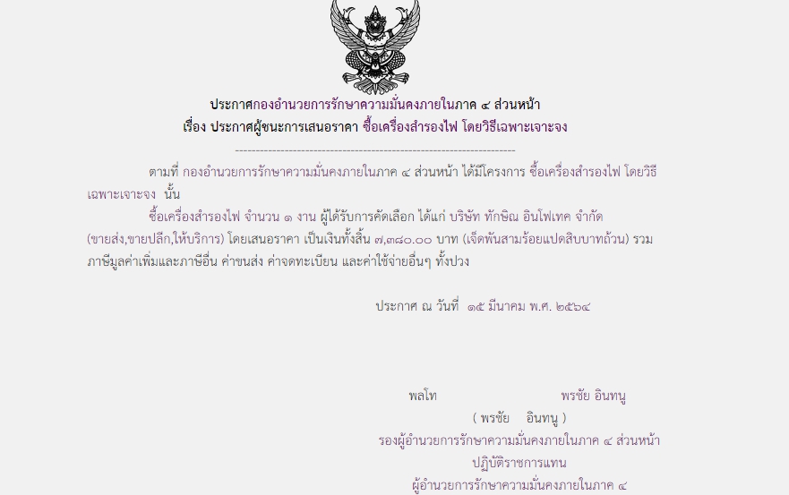 ประกาศผู้ชนะการเสนอราคา ซื้อตัวเครื่องสำรองไฟ โดยวิธีเฉพาะเจาะจง ( ๗,๓๘๐.๐๐ บาท )
