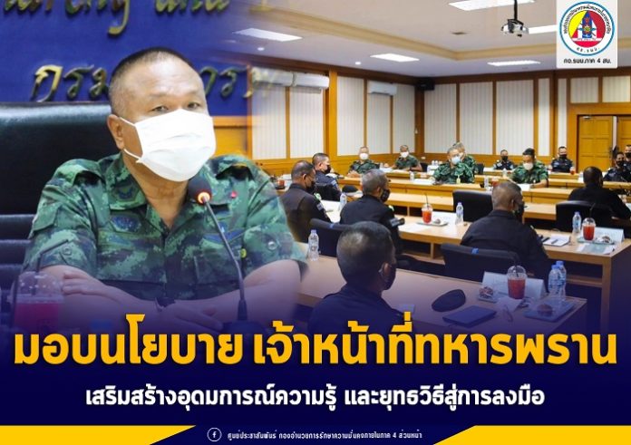 วันนี้ 4 พฤษภาคม 2564 เวลา 11.00 น. พลโท เกรียงไกร ศรีรักษ์ แม่ทัพภาคที่ 4/ผู้อำนวยการรักษาความมั่นคงภายในภาค 4 เดินทางพร้อมด้วย คณะที่ปรึกษา และฝ่ายอำนวยการกองอำนวยการรักษาความมั่นคงภายในภาค 4 ส่วนหน้า มายังห้องประชุมพรานไพร กองกำลังทหารพรานจังหวัดชายแดนภาคใต้ ค่ายอิงคยุทธบริหาร อำเภอหนองจิก จังหวัดปัตตานี เพื่อตรวจเยี่ยมการปฏิบัติงาน และมอบนโยบายให้แก่กำลังพลเจ้าหน้าที่หน่วยเฉพาะกิจกรมทหารพราน 43 เน้นย้ำการปฏิบัติงานให้คงประสิทธิภาพ ปฏิบัติภารกิจในการดูแลควบคุมพื้นที่ให้เกิดความปลอดภัย ด้วยยุทธศาสตร์คนดีไม่สร้างเงื่อนไข พร้อมทั้งเสริมสร้าง อุดมการณ์ ความรู้ ยุทธวิธีสู่การแก้ไขปัญหาจังหวัดชายแดนภาคใต้ ให้แก่ผู้บังคับหน่วยระดับผู้บังคับกองร้อยทหารพรานด้วยนโยบายสู่การปฏิบัติในทุกมิติ ถ่ายทอดองค์ความรู้และประสบการณ์ ไปให้ถึงเจ้าหน้าที่แนวหน้าสู่การลงมือทำ ตอบสนองต่อเป้าหมายในทุกภารกิจได้อย่างมีประสิทธิภาพ ในการปฏิบัติการเชิงรุก ต้องมีความเข้าใจ เข้าถึง พร้อมพัฒนาศักยภาพหน่วยกำลังรบ ควบคู่ไปกับการรักษาความมั่นคงปลอดภัยในพื้นที่ โดยมี พันเอก ทวีพร คณะทอง ผู้บังคับการกรมทหารพรานที่ 43 ให้การต้อนรับและร่วมรับฟังนโยบาย