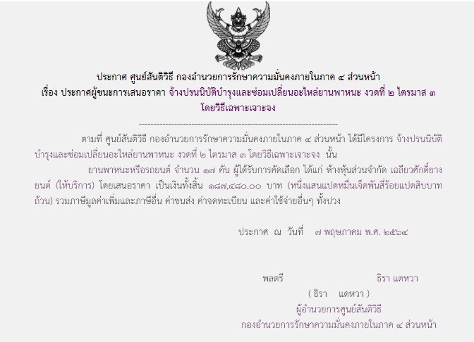 จัดซื้อ จัดจ้างประกาศผู้ชนะการเสนอราคา ประกาศผู้ชนะการเสนอราคา จ้างปรนนิบัติบำรุงและซ่อมเปลี่ยนอะไหล่ยานพาหนะ งวดที่ ๒ ไตรมาส ๓ โดยวิธีเฉพาะเจาะจง ( ๑๘๗,๔๘๐.๐๐ บาท ) May 7, 2021 928 Share Facebook Twitter Google+ Telegram LINE ศูนย์สันติวิธี กอ.รมน.ภาค ๔ สน.