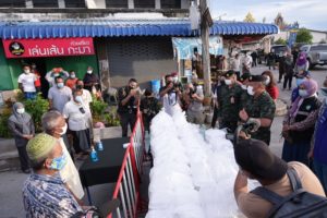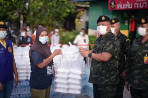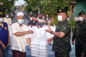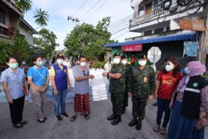 วันนี้ 8 พฤษภาคม 2564 เวลา 17.30 น. พลโทเกรียงไกร ศรีรักษ์ แม่ทัพภาคที่ 4 /ผู้อำนวยการรักษาความมั่นคงภายในภาค 4 พร้อมด้วย พลตรีไพศาล หนูสังข์ ผู้บัญชาการกองพลทหารราบที่ 15 พลตรีคมกฤช รัตนฉายา ผู้บัญชาการมณฑลทหารบกที่ 46 เดินทางลงพื้นที่เทศบาลเมืองปัตตานี ให้กำลังใจเจ้าหน้าที่ และพี่น้องประชาชน ที่ได้รับความเดือดร้อนจากการแพร่ระบาดของเชื้อไวรัส covid-19 พร้อมหารือการปฏิบัติให้หน่วยในพื้นที่เข้าดำเนินการช่วยเหลือ สนับสนุนยุทโธปกรณ์ กำลังพล อำนวยความสะดวกให้แก่พี่น้องประชาชนที่ได้รับความเดือดร้อนอย่างทันท่วงที โดยมณฑลทหารบกที่ 46 และกองพันทหารราบที่ 2 กรมทหารราบที่ 153 พลทหารราบที่ 15 ได้จัดครัวสนามให้บริการอาหารและน้ำดื่มช่วยเหลือประชาชนในพื้นที่เทศบาลเมืองปัตตานี ที่ได้รับผลกระทบจากการแพร่ระบาดของเชื้อไวรัส covid-19 บริเวณถนนปากน้ำซอย 2 ชุมชนบือติงตันหยง เทศบาลเมืองปัตตานี จังหวัดปัตตานี โดยได้จัดทำเป็นอาหารปรุงสุก แจกอาหารและเครื่องดื่มให้แก่ประชาชน ในชุมชนดังกล่าว ซึ่งมีประกาศล็อคดาวน์จากทางจังหวัด เนื่องจากมีผู้ติดเชื้อไวรัส covid 19 แพร่กระจายในชุมชน และมีผู้เสี่ยงสูงอาศัยอยู่ในชุมชนดังกล่าว 228 ครัวเรือน ประชากรประมาณ 1,300 คน โดยมีเจ้าหน้าที่ฝ่ายปกครอง ผู้นำชุมชน ประสานผู้แทนแต่ละครอบครัว ออกมารับอาหารและปฏิบัติตามมาตรการป้องกันการแพร่ระบาดของเชื้อไวรัส covid-19 เพื่อความปลอดภัยสูงสุด