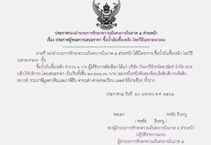 ประกาศผู้ชนะการเสนอราคา ซื้อน้ำมันเชื้อเพลิง โดยวิธีเฉพาะเจาะจง ( ๒๑,๒๗๔.๗๐ บาท )