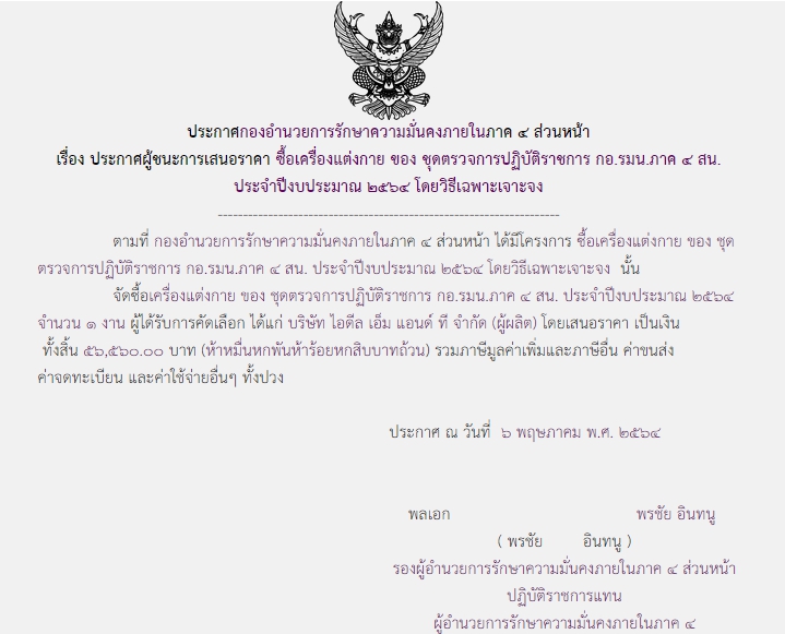 จัดซื้อ จัดจ้างประกาศผู้ชนะการเสนอราคา ประกาศผู้ชนะการเสนอราคา ซื้อเครื่องแต่งกาย ของ ชุดตรวจการปฏิบัติราชการ กอ.รมน.ภาค ๔ สน. ประจำปีงบประมาณ ๒๕๖๔ โดยวิธีเฉพาะเจาะจง ( ๕๖,๕๖๐.๐๐ บาท ) May 9, 2021 606 Share Facebook Twitter Google+ Telegram LINE กอ.รมน.ภาค ๔ สน.