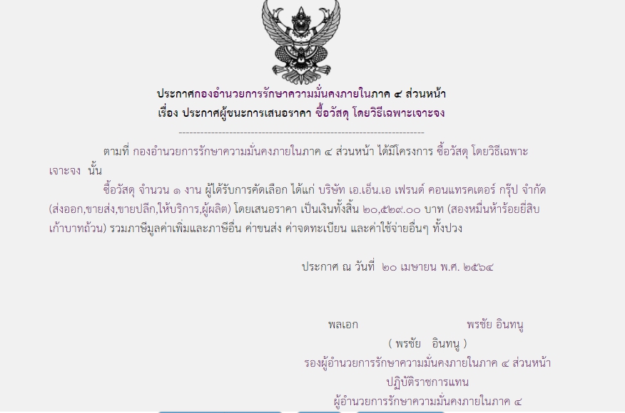 ประกาศผู้ชนะการเสนอราคา ซื้อวัสดุ โดยวิธีเฉพาะเจาะจง ( ๒๐,๕๒๙.๐๐ บาท )