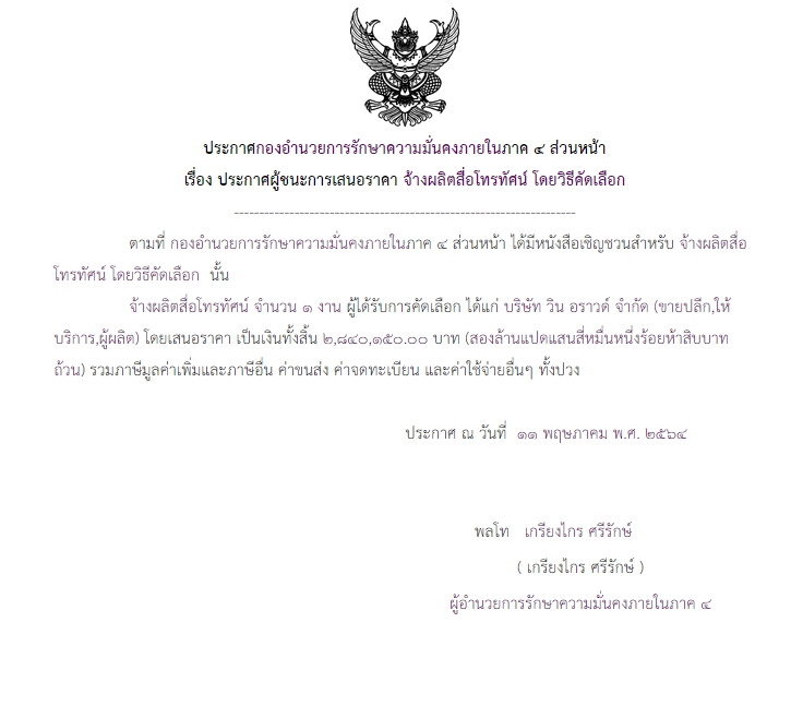 จัดซื้อ จัดจ้างประกาศผู้ชนะการเสนอราคา ประกาศผู้ชนะการเสนอราคา จ้างผลิตสื่อโทรทัศน์ โดยวิธีคัดเลือก ( ๒,๘๔๐,๑๕๐.๐๐ บาท ) May 11, 2021 627 Share Facebook Twitter Google+ Telegram LINE กอ.รมน.ภาค ๔ สน.