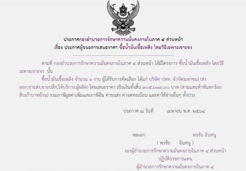 ประกาศผู้ชนะการเสนอราคา ซื้อน้ำมันเชื้อเพลิง โดยวิธีเฉพาะเจาะจง ( ๓๐๕,๖๑๙.๐๐ บาท )