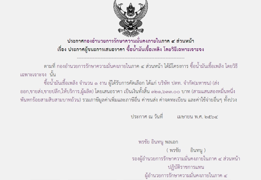 จัดซื้อ จัดจ้างประกาศผู้ชนะการเสนอราคา ประกาศผู้ชนะการเสนอราคา ซื้อน้ำมันเชื้อเพลิง โดยวิธีเฉพาะเจาะจง ( ๓๒๑,๖๓๓.๐๐ บาท ) May 12, 2021 542 Share Facebook Twitter Google+ Telegram LINE กอ.รมน.ภาค ๔ สน.