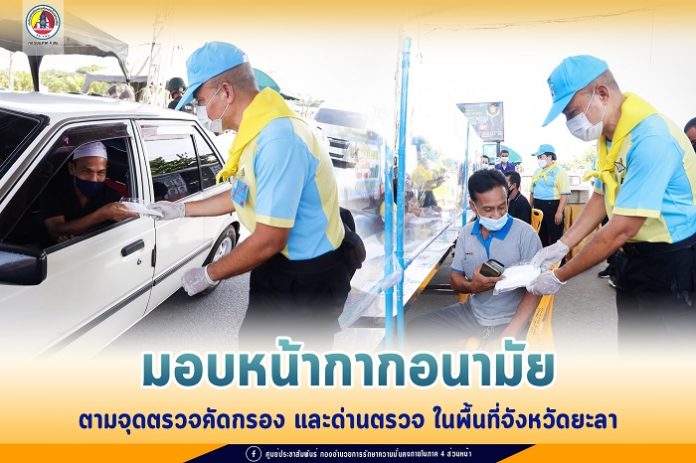 ทั้งนี้ ผู้บังคับหน่วยเฉพาะกิจยะลา ได้มอบหน้ากากอนามัยกว่า 20,000 ชิ้น ให้เจ้าหน้าที่เพื่อแจกจ่ายให้กับประชาชนที่สัญจรไป-มา และประชาสัมพันธ์ ให้สวมหน้ากากอนามัยก่อนออกจากบ้านทุกครั้ง เพื่อป้องกันการแพร่ระบาดของเชื้อไวรัส COVID-19 รวมทั้งยังมอบเครื่องบริโภคให้กับเจ้าหน้าที่ประจำด่านตรวจอีกด้วย