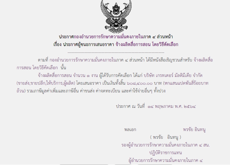ประกาศผู้ชนะการเสนอราคา จ้างผลิตสื่อการสอน โดยวิธีคัดเลือก ( ๖๐๘,๔๐๐.๐๐ บาท )