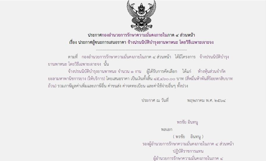 ประกาศผู้ชนะการเสนอราคา จ้างปรนนิบัติบำรุงยานพาหนะ โดยวิธีเฉพาะเจาะจง ( ๔๕,๔๖๐.๐๐ บาท )