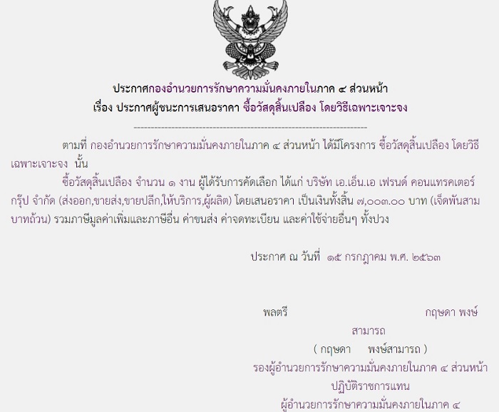 ประกาศผู้ชนะเสนอราคา ซื้อวัสดุสิ้นเปลือง โดยวิธีเฉพาะเจาะจง