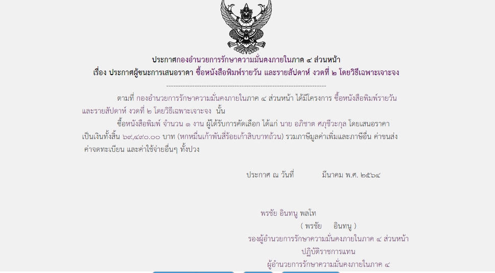 จัดซื้อ จัดจ้างประกาศผู้ชนะการเสนอราคา ประกาศผู้ชนะการเสนอราคา ซื้อหนังสือพิมพ์รายวัน และรายสัปดาห์ งวดที่ ๒ โดยวิธีเฉพาะเจาะจง ( ๖๙,๔๙๐.๐๐ บาท ) May 18, 2021 579 Share Facebook Twitter Google+ Telegram LINE กอ.รมน.ภาค ๔ สน.
