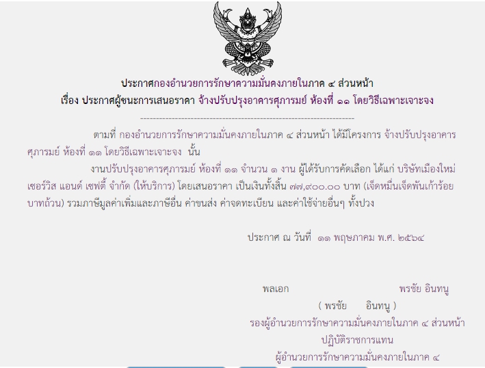 จัดซื้อ จัดจ้างประกาศผู้ชนะการเสนอราคา ประกาศผู้ชนะการเสนอราคา จ้างปรับปรุงอาคารศุภารมย์ ห้องที่ ๑๑ โดยวิธีเฉพาะเจาะจง ( ๗๗,๙๐๐.๐๐ บาท ) May 18, 2021 576 Share Facebook Twitter Google+ Telegram LINE กอ.รมน.ภาค ๔ สน.