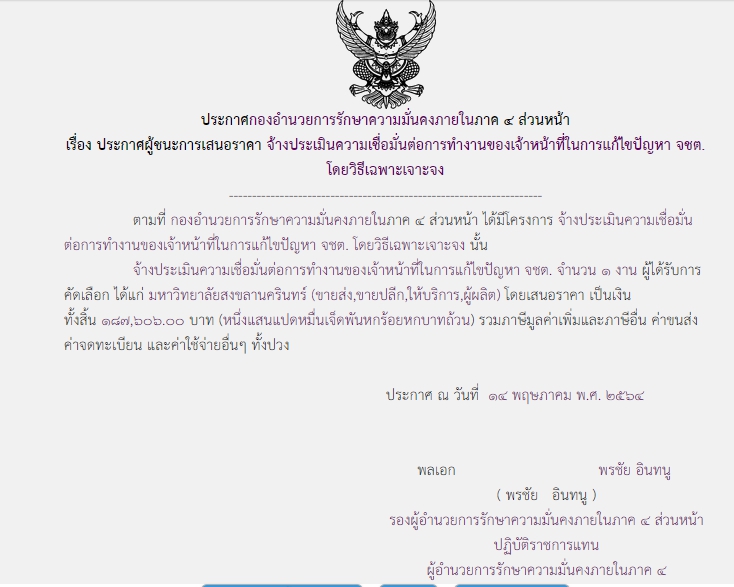 จัดซื้อ จัดจ้างประกาศผู้ชนะการเสนอราคา ประกาศผู้ชนะการเสนอราคา จ้างประเมินความเชื่อมั่นต่อการทำงานของเจ้าหน้าที่ในการแก้ปัญหา จชต. โดยวิธีเฉพาะเจาะจง ( ๑๘๗,๖๐๖.๐๐ บาท ) May 21, 2021 609 Share Facebook Twitter Google+ Telegram LINE กอ.รมน.ภาค ๔ สน.