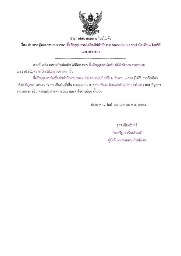 ประกาศผู้ชนะการเสนอราคา ซื้อวัสดุอุปกรณ์เครื่องใช้สำนักงาน ของหน่วย มว.รวป.อโณทัย ๒ โดยวิธีเฉพาะเจาะจง ( ๖,๖๘๘.๐๐ บาท )
